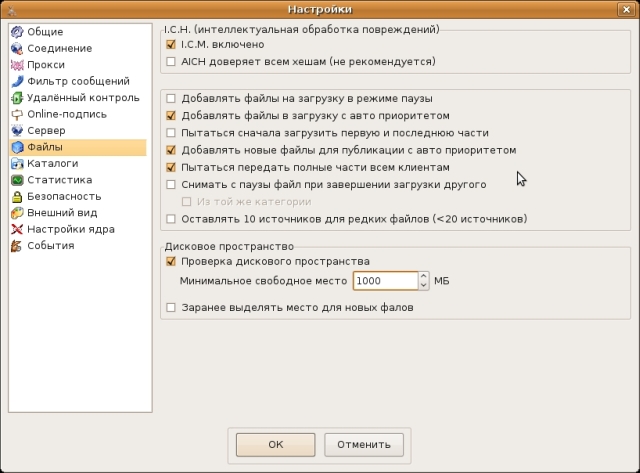 7. В пункте «Файлы» все настройки оставляем по умолчанию, по вашему желанию можно количество минимального свободного места на диске.