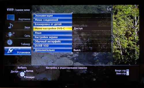 2. В появившемся меню, выберите вкладку УСТАНОВКИ. На этой вкладке выбираем пункт МЕНЮ НАСТРОЙКИ DVB-C, нажимаем кнопку ОК.