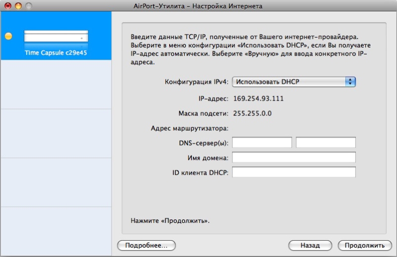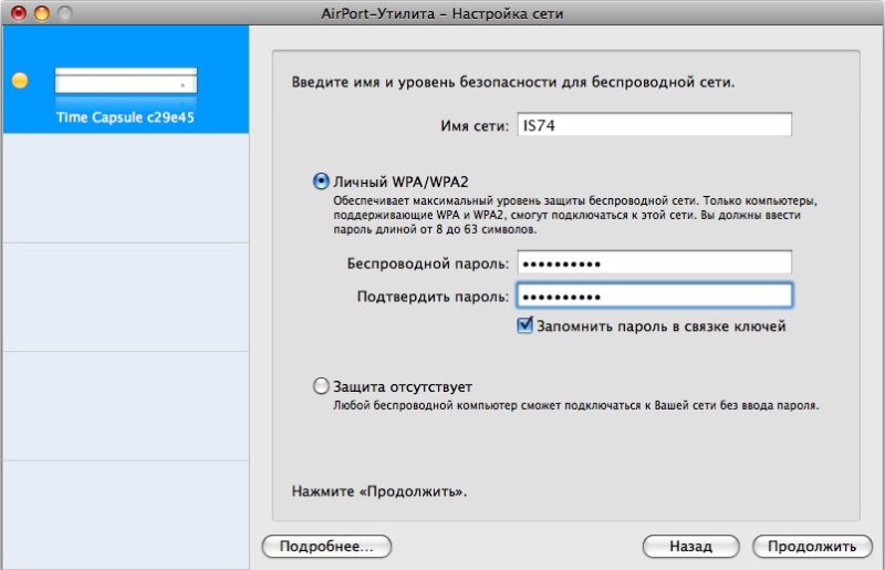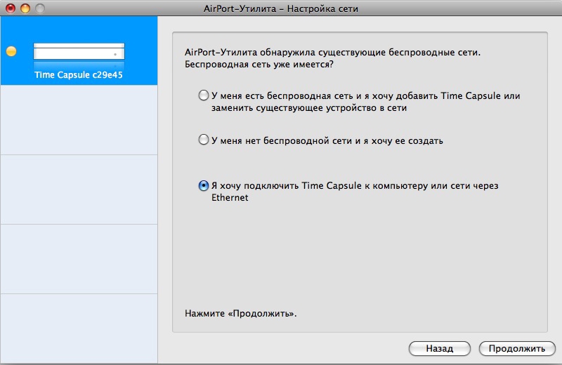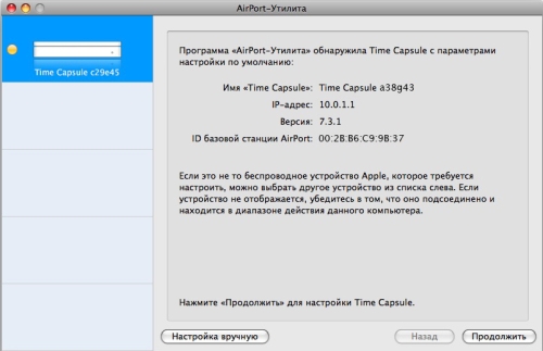 2) Далее необходимо зайти в приложение AirPort-утилита (Программы-Утилиты). В левой колонке вы увидите Time Capsule. Справа представлена информация о данном устройстве. В этом окне нажимаем «Продолжить».