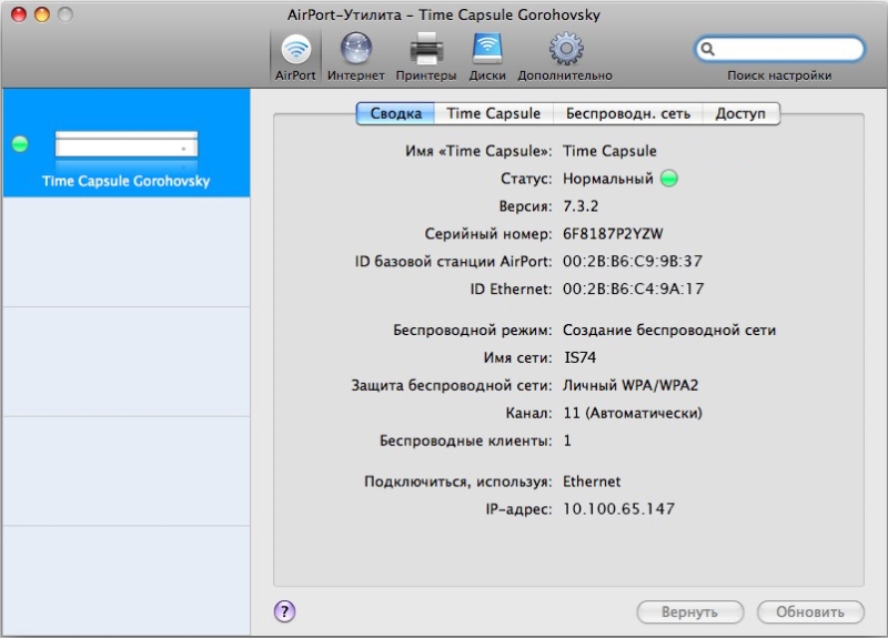 После этого точка перегружается и начинает работать. Об этом будет свидетельствовать зеленый светодиод как на TimeCapsule, так и в AirPort-утилите: